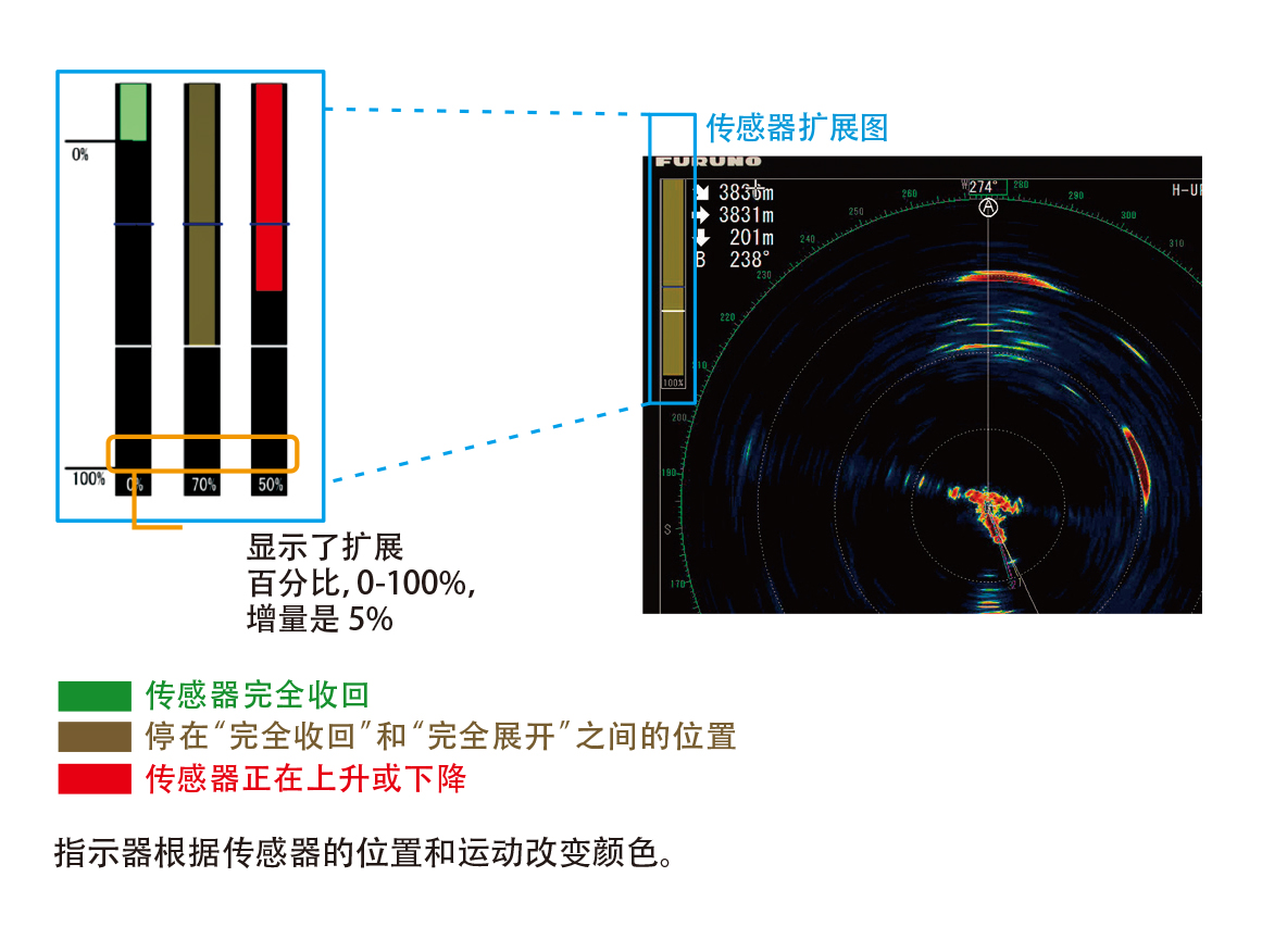 为了避免与漂浮木材和其他材料发生碰撞,可以在移动时停止传感器。传感器可以降低到任何给定长度,直至完全展开。 -